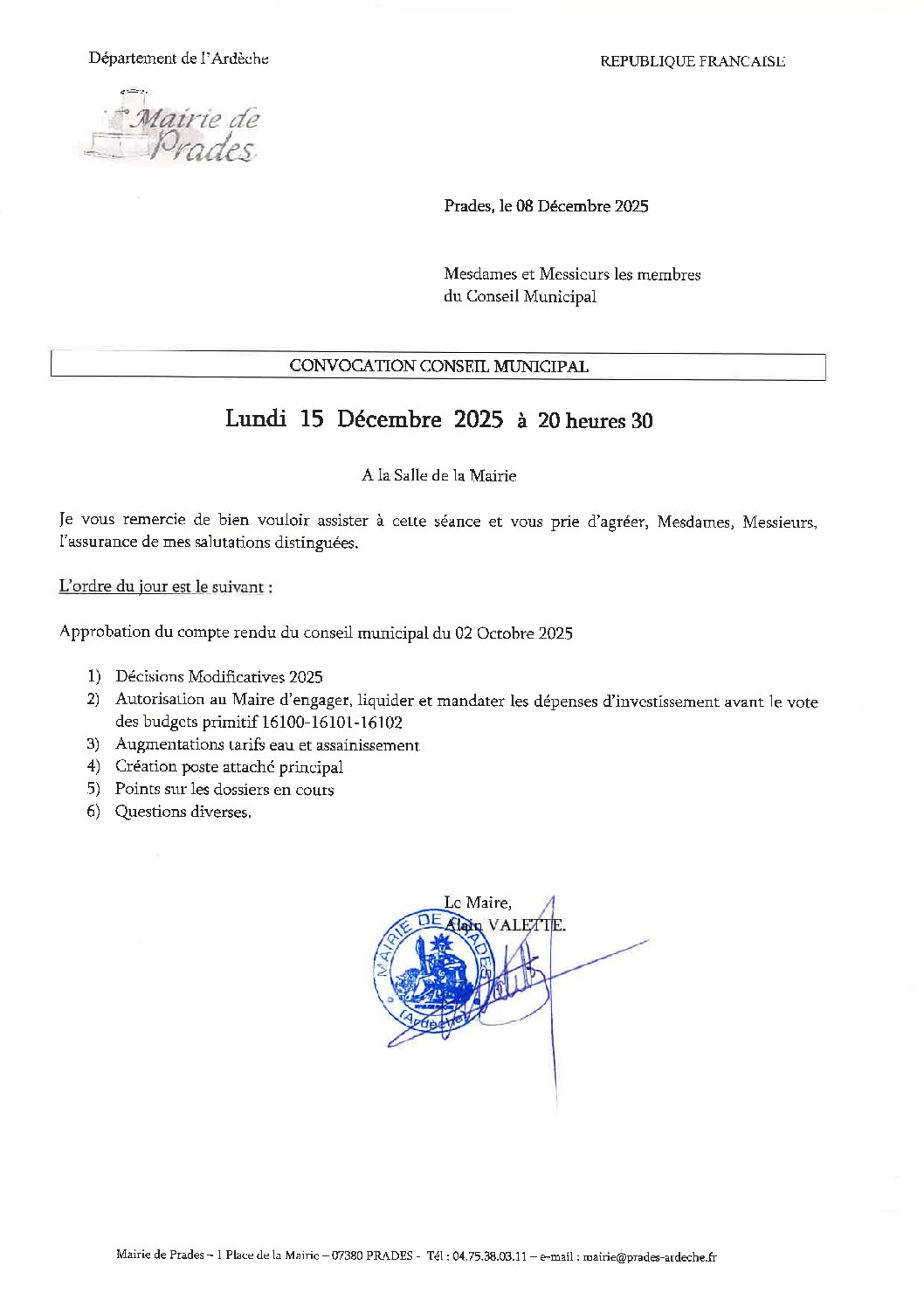 Convocation au Conseil Municipal du 15 Décembre 2025