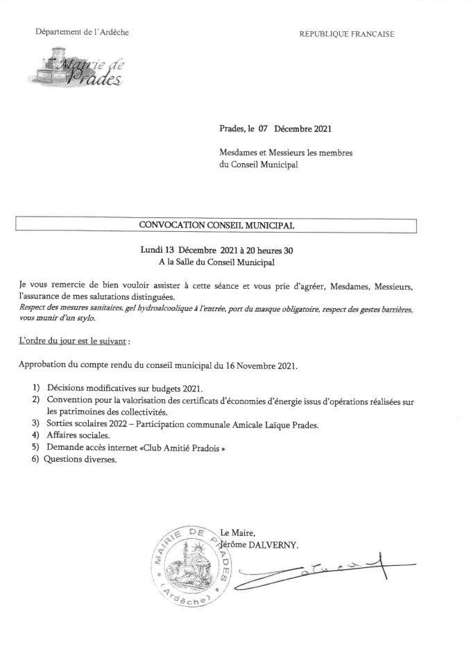 Réunion du conseil municipal du 13 décembre 2021